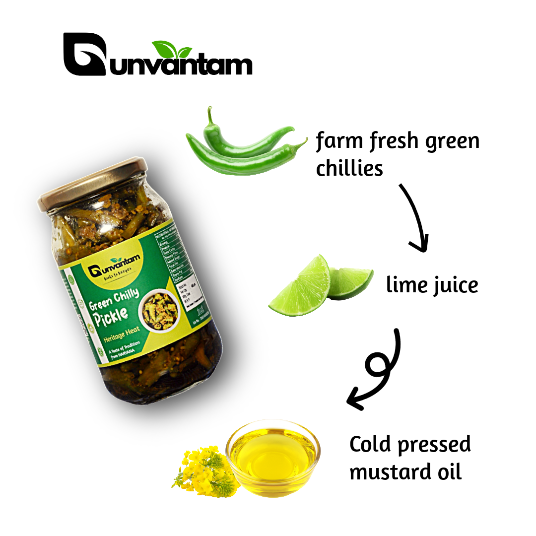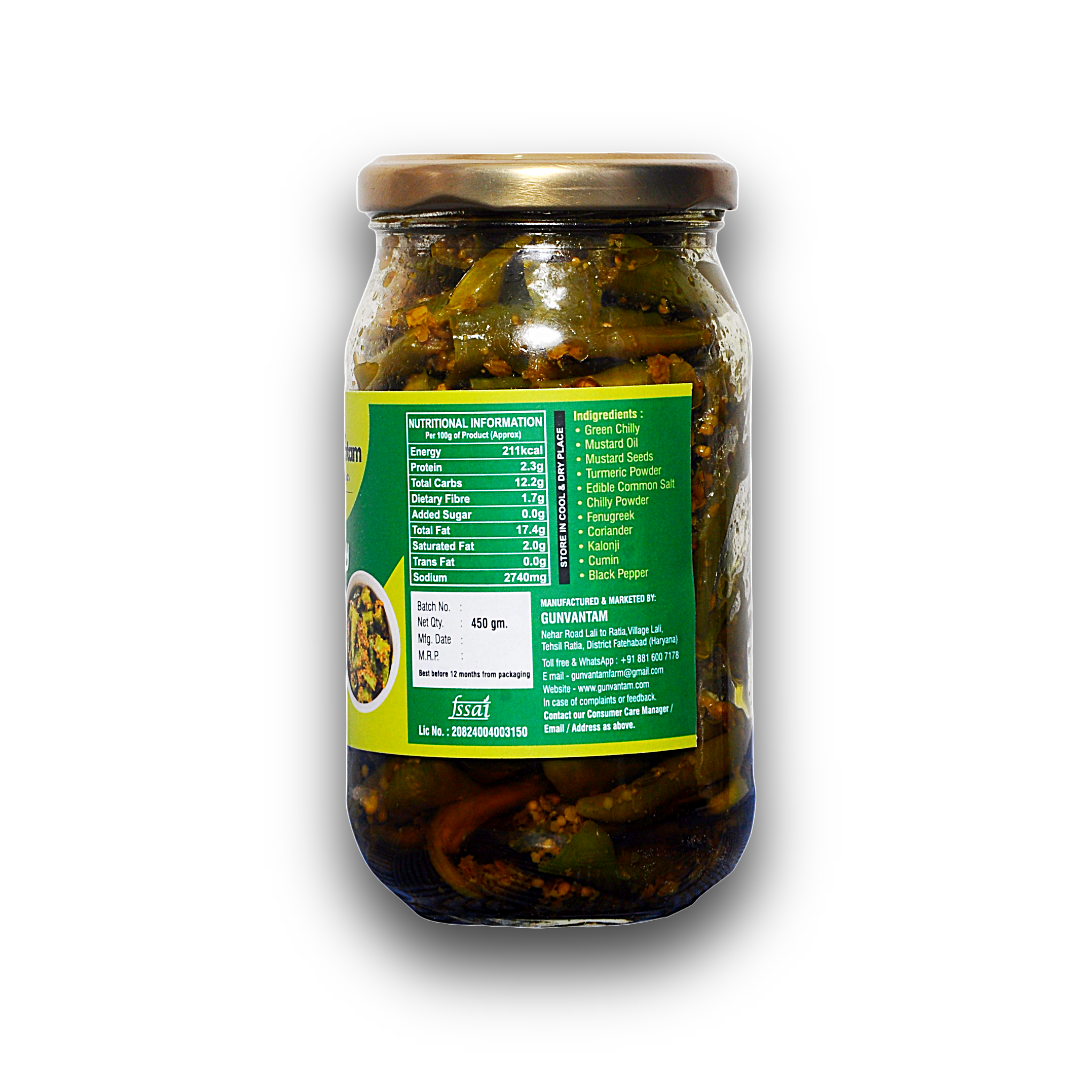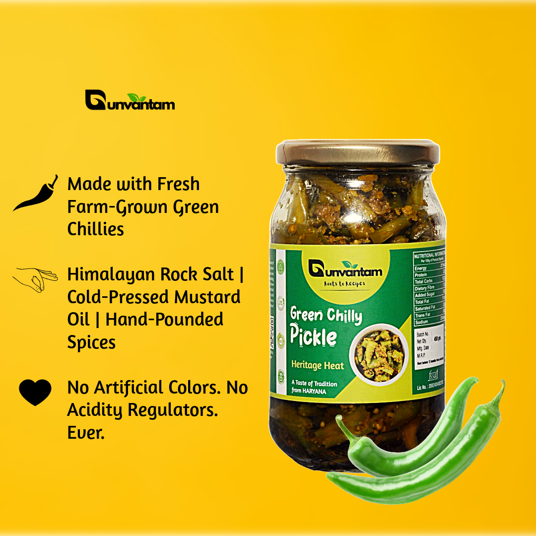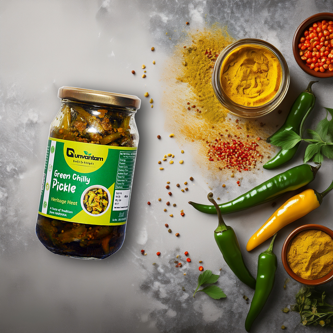 Spice up your meals with Gunvantam Farms Green Chilly Pickle – a fiery, tangy delight made from handpicked green chilies, blended with aromatic spices, and preserved in pure cold-pressed mustard oil. Crafted using a traditional recipe, this pickle bursts with bold flavors, adding the perfect kick to your everyday meals.